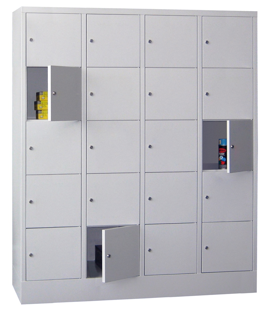 Schließfachschrank auf Sockel, Fächer ohne Inneneinrichtung, Türen einschlagend - glatt, Vollblech. Mit Sichtfenstertüren gegen Aufpreis. Lichte Fachmaße: bei Fachbreite 300 mm: Höhe 315 mm, Breite 230, Tiefe 470 mm, bei Fachbreite 400 mm: Höhe 315 mm, Breite 330, Tiefe 470 mm. In vielen weiteren individuellen Farbkombinationen und Varianten möglich. Entwickelt und produziert ausschließlich "Made in Germany"